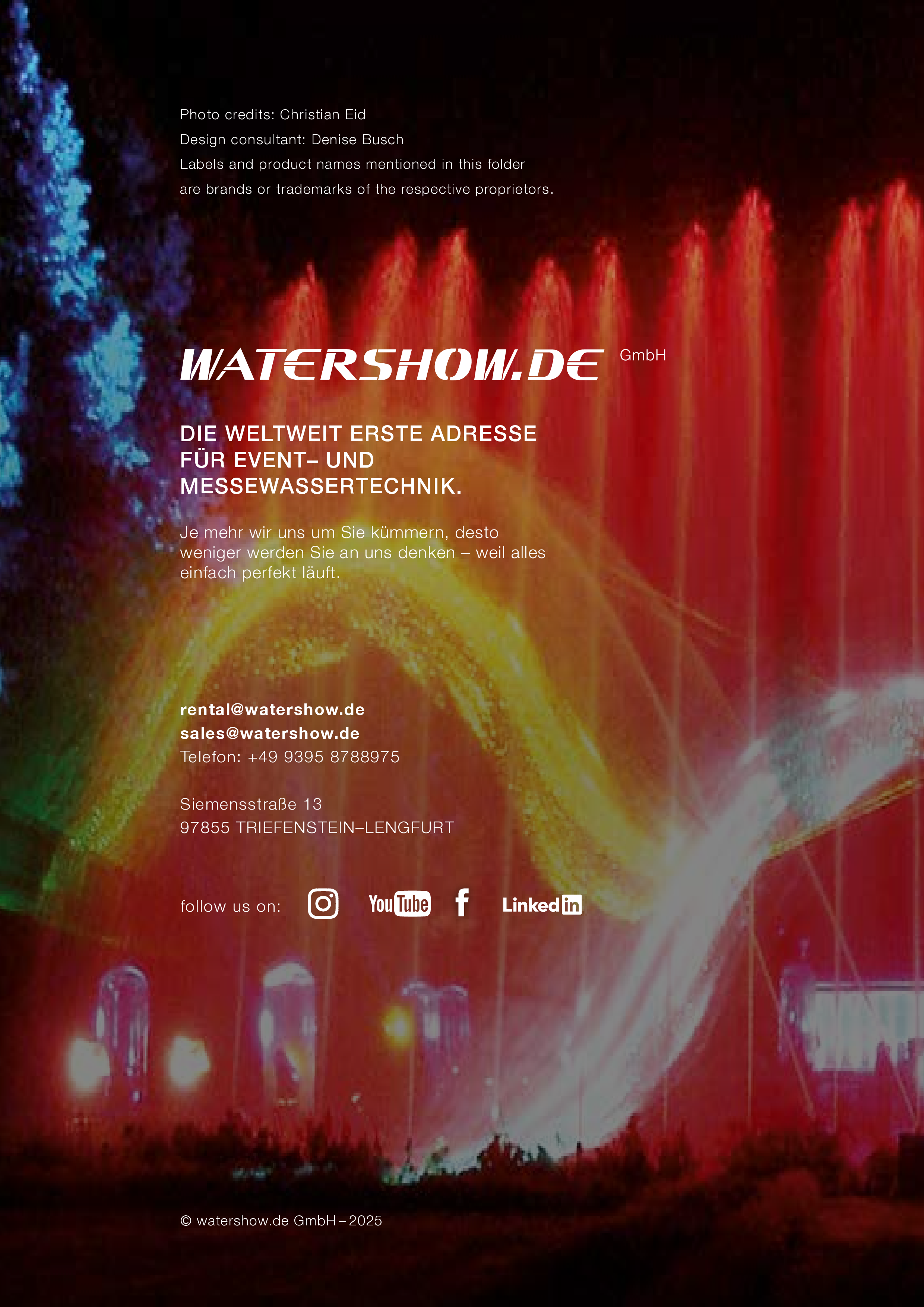 Watershow.de GmbH verwandelt Wasser in unvergessliche Erlebnisse. Von funkelnden Fontänen und eleganten Wasserwänden bis hin zu hochmodernen Wasserscreens, die Logos und Bilder mit fallenden Tropfen schreiben. Jede Show ist ein einzigartiges Highlight. Mit individuellen Lösungen, perfekter Technik und beeindruckender visueller Wirkung lässt Watershow.de Marken erstrahlen und Events unvergesslich werden.